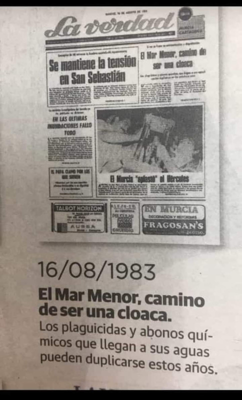 Una es las aguas residuales que durante años y todavía siguen descargan a emisarios en el mar, o como siempre las roturas de las depuradoras que hay en las poblaciones que funcionan SIEMPRE MAL y mientras termina el verano no hay más remedio que volver al emisario descargador. Otra y casi más acuciante los regadíos intensivos SI O SI. Ya se decía esto hace muuuuuchos años y por supuesto de estas 2 cosas, el culpable es el político-os que lo han permitido SIEMPRE. Aquí se ve claro hace cuanto tiempo y denunciado estaba ![]() |