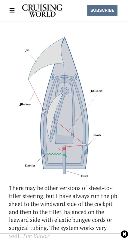 La Yola de Webb Chiles capeaba a vela de maravilla gracias al trapito a popa que es precisamente lo que es una Yola y para lo que surge; pero un par de veces dobló la mecha del timón, pues la ola le da un buen empujón al barquito y marcha atrás es ya suficiente stress para el timón y/o el barquito por así decirlo se sienta encima del timón y lo avería, este es un viejo problema Como piloto automático usaba "Escota del Foque a la caña del timón", Webb Chiles es seguramente el navegante que más miles de millas ha hecho con este sistema de encargar a la Escota del Foque que lleve el timón ayudado por una goma de tirachinas ![]() En el siguiente vídeo: Webb Chiles en el océano Índico en su sexta o séptima vuelta al mundo: la Escota del Foque (o una vela de proa reducida al tamaño de un Foque) se encarga de manejar la caña del timón |