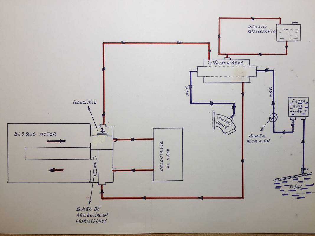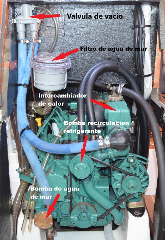 Son operaciones en general sencillas que seguro que la mayoría las realizáis sin menor problema, pero puede que el hilo sea de utilidad para alguien que tenga que hacer este tipo de mantenimiento y todavía no tenga práctica o el conocimiento necesario. En algunos casos se incluyen trucos sencillos para realizar alguna de las operaciones o para solventar algún problema. Par más claridad en algunos casos se incluyen también los principios de funcionamiento del componente Vuestras aportaciones, opiniones, trucos que utilizáis etc seguro que ayudaran a mejorar este hilo y a facilitar la realización de estas operaciones. El motor es un Volvo-Penta MD2030D de 2005 con refrigeración indirecta y transmisión Saildrive 130-S. Las horas actuales de motor son 1.800. ![]() Las tareas de mantenimiento que se describen comprenden todo el sistema de refrigeración. En cada tarea se indicará el tiempo/horas motor transcurridas desde la última vez que se realizó, aportando imágenes del estado antes y después de la intervención para que se pueda observar como afectó ese tiempo a esa parte del motor. El sistema de refrigeración se divide en dos circuitos independientes, cada uno con las operaciones de mantenimiento siguientes: Circuito de REFRIGERANTE/ANTICONGELATE: 1) Vaciado del líquido refrigerante/anticongelante. 2) Desmontaje y limpieza del intercambiador de calor. 3) Bomba de recirculación de refrigerante y termostato. 4) Relleno con nuevo refrigerante/anticongelante. Circuito de AGUA DE MAR: 1) Limpieza de la toma de agua de mar 2) Limpieza del filtro de agua. 3) Limpieza de la válvula de vacío anti-sifón. 4) Verificación-cambio del rodete de la bomba de agua de mar. 5) Limpieza del codo de escape. Para no hacer intervenciones demasiado largas, haré una independiente por cada una de las tareas descritas más arriba. Comenzamos viendo el ESQUEMA COMPLETO DEL SISTEMA DE REFRIGERACIÓN con los dos circuitos independientes: ![]() El CIRCUITO DE AGUA DE MAR Aspira el agua a través de la cola sail-drive, pasa a través de un filtro de agua de mar y a continuación va a la bomba de agua salada. A la salida de la bomba la tubería forma un cuello de cisne con una válvula de vacío en la parte superior (no representada en el esquema) para evitar el efecto sifón. A continuación el agua es conducida al intercambiador de calor donde enfría el refrigerante. Finalmente pasa al codo de escape dónde el agua salada es inyectada en el conducto de gases de escape. Ahí el agua cumple la misión de evitar altas temperaturas en el conducto y tiene además un efecto silenciador por las turbulencias creadas en el colector de aguas y también en el silenciador, si el sistema lo equipa. EL CIRCUITO DE REFRIGERANTE/ANTICONGELANTE Mientras el motor esta frío, la bomba de recirculación impulsa el líquido a través del bloque del motor. Como el termostato está cerrado, el refrigerante, que se va calentando, circula a través del calentador de agua (si existe) y retorna a la bomba de re-circulación y de ahi nuevamente al bloque motor, y así sucesivamente. Cuando el líquido alcanza la temperatura de inicio de apertura del termostato (82 ºC en este motor), parte del líquido pasa hacia el intercambiador y retorna a la bomba y otra parte sigue circulando a través del calentador. A medida que va aumentando la temperatura del refrigerante, mas porcentaje de líquido circulará por el intercambiador, hasta conseguir un equilibrio que mantiene al motor dentro de su temperatura de régimen. Editado por Icarus en 11-04-2023 a las 15:11. |