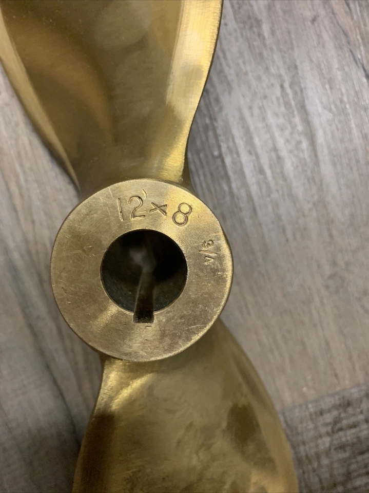 Concretamente, esa hélice tiene 12" de diámetro, 8" de paso y giro a izquierdas (LH). También figura el diámetro del eje (3/4"), por lo que la conicidad será la que indica la norma SAE norteamericana: 1:12. Si el diámetro fuera en mm, la conicidad sería 1:10, que es la de la norma ISO.