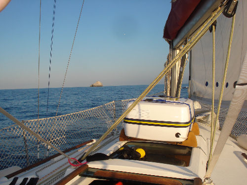 Nota técnica: Para que la balsa no nos hiciera perder mucho sitio bajo la botavara, la hemos desplazado hacia proa (hacia el mástil) todo lo posible. Esto ha obligado a poner una polea nueva bajo la botavara, junto a la contra, para evitar que la escota de la botavara roce la balsa en las maniobras.