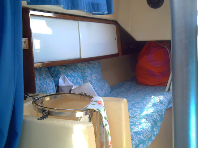 Lo primero que hice al comprarlo fue sanear a fondo todos los interiores. Lo pelé entero, desmonté todo lo desmontable y lo pinté a conciencia. Para ello le di antes una imprimación, de dos componentes: Hempel poliprimer 25050 y después otras dos manitas de esmalte de poliuretano de dos componentes, también Hempel (concretamente Hempel Polyenamel 55100). También decapé la madera, la lijé para dejarla nuevecita (incluída la escala de acceso) y le di un barniz satinado que ahora no recuerdo el nombre pero es cuestión de buscarlo si alguien quiere más detalles. En el enlace que os pongo encontraréis un montón de fotos de todo el proceso, que lo hicieron estas dos manitas que ahora escriben y que acabaron muy maltrechas durante una buena temporada